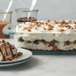 Working with frozen treats can be a bit of a race against the clock, but don’t let that worry you. My best advice is to chill your serving plate in the freezer for 20 minutes before you unmold the cake. This keeps the bottom from melting while you are adding the decorations. For more easy frozen ideas, you might enjoy my chocolate eclair cake which uses similar simple layers.