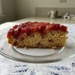 A fresh strawberry rhubarb cake sitting on a kitchen counter